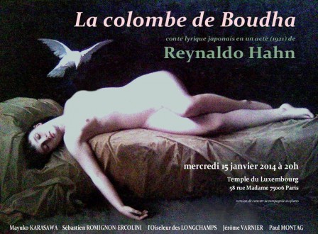 La Cie de l'oiseleur, les Fêtes Lyriques et l'association Reynaldo Hahn sont heureux de vous convier au concert exceptionnel "la colombe de Bouddha" conte lyrique japonais en un acte de Hahn, repris 90 ans après sa création, grâce à une magnifique équipe d'artistes talentueux, curieux et généreux (concert "au chapeau") qui vous feront découvrir un vrai petit bijou ! Venez nombreux, dans un mois exactement.